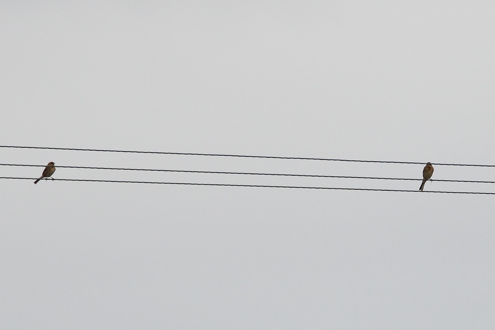 We joined a couple of ADBC members looking for the Iceland Gull. Cormorants and Golden Plovers were added but the Iceland Gull remained frustratingly elusive. We decided to move on. Having driven past the Auchmithie junction and the field where we'd seen Golden Plover the week before, Jacqui spotted birds on the wires by the Kinaldie Cattery and Kennels. Stopping the car the first bird I looked at was a