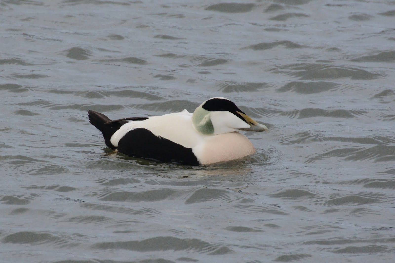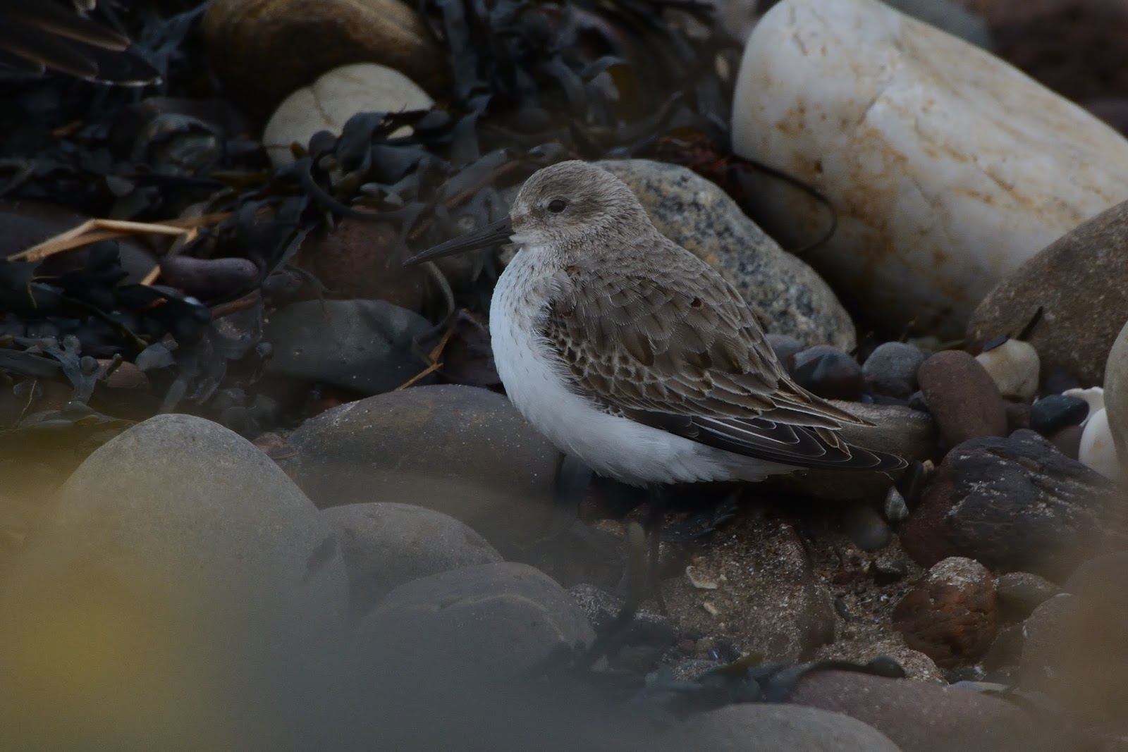 I was sheltering against the wall of the railway line at the footbridge over the burn which meant that I was mostly out of the worst of the wind, making it not as uncomfortable as it might have been otherwise. There weren't many dog walkers around except for a few hardy souls so disturbance was minimal. Scanning out over the river I found a few Eiders and a single Dunlin flew past much closer in. A Grey Plover was seen low over the sea, the tell-tale black 'armpit' patch showing well. Slightly more of a surprise was the young Kittiwake which briefly dropped in amongst the Black Headed Gulls before heading off eastwards again.