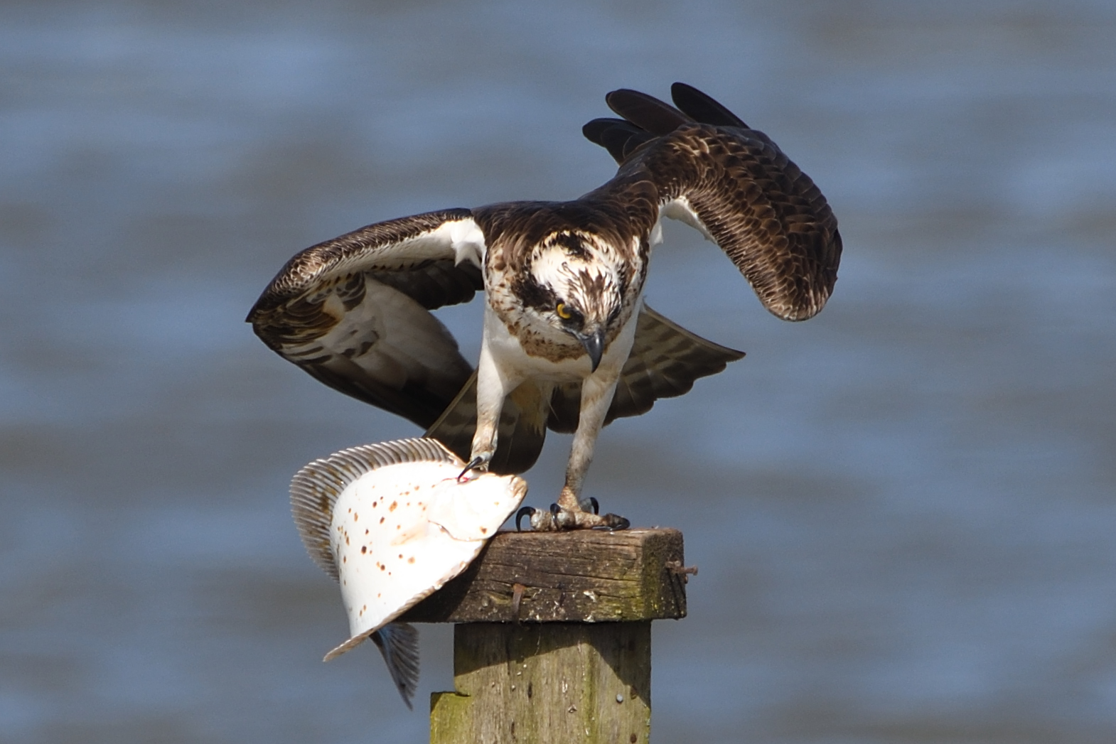 It didn't take long before John's luck changed. We had more or less just sat down and oped the windows when John told me to look behind me at the post. An Osprey had landed on it with a large flatfish and with the sun shining and water behind we had a great opportunity to get some nice photos of the bird. It wasn't ringed and didn't have any radio-pack which was even better from a photographic point of view. We snapped away as the bird struggled to drag the fish onto the top of the pole. With its talons holding the top and bottom side of the fish it proved a tricky manoeuvre though after a few minutes the bird succeeded. After taking the first 2 chunks from the fish, from around the mouth area, a pair of Carrion Crows flew past. The Osprey seemed unnerved by them and watched them go by.
