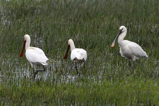 Another Osprey was seen as well as a Buzzard from the hide further up the hill where we'd retreated to in the hope of the raised view helping us find the elusive Black Stork, but it wasn't to be. The Marsh Harrier re-appeared causing some panic among the ducks and the Spoonbill trio flew in and landed close in front of the Dunbar Hide. Needless to say this resulted in me hurrying down to get better photos, which I succeeded in doing, as well as some video. Great Tit was noted on the walk back to the visitor centre and a Pheasant and Coot were seen out front. A Lesser Redpoll male flew over as we were getting into the car around 1315 to head south towards the Ythan via Bullers of Buchan where Ian hoped to be able to add Puffin to his year-list.