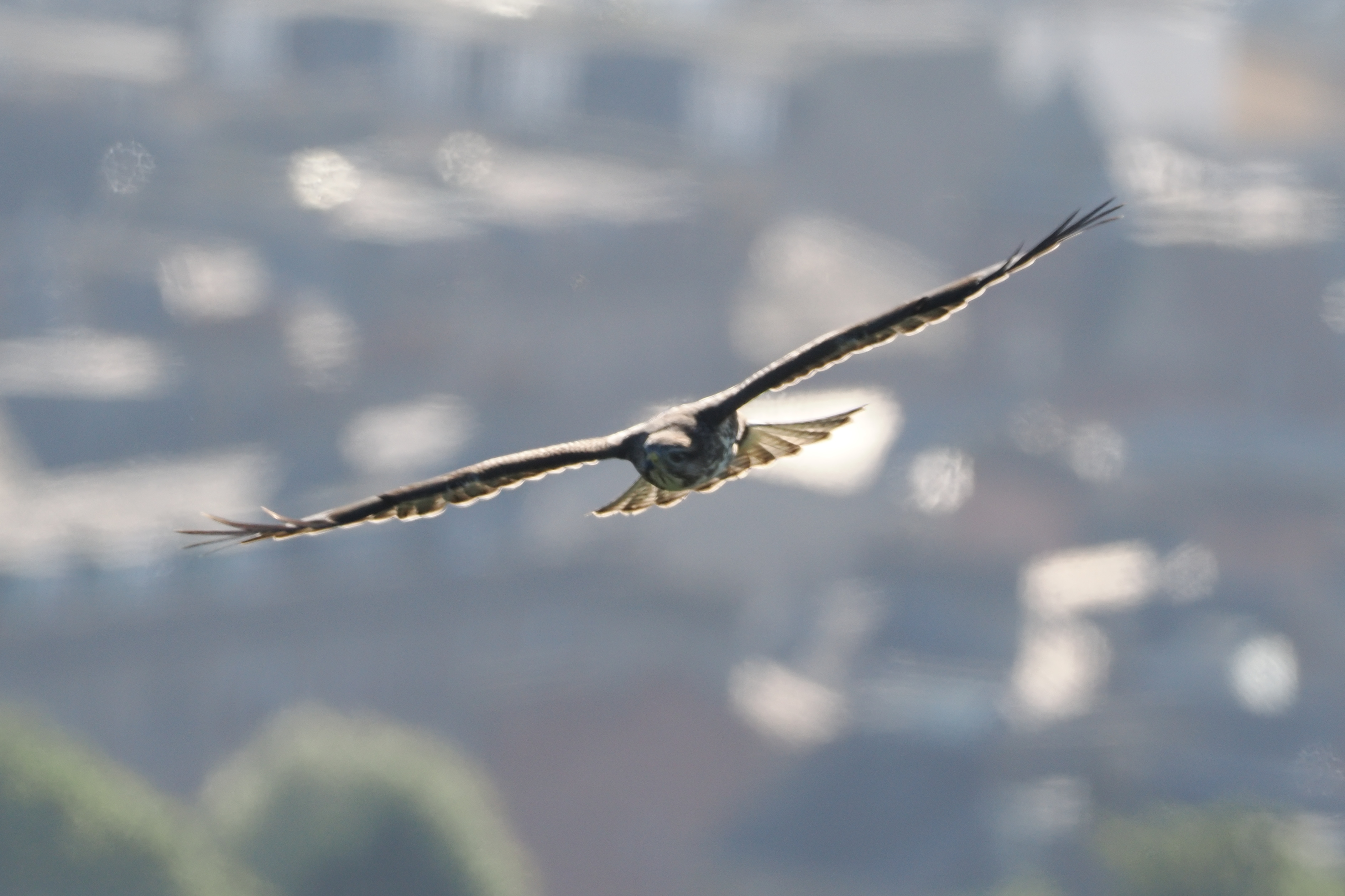 Just as I was about to give up the first 2 Sparrowhawks of the morning put in an appearance. The walk home added Bullfinch near the allotments, Lesser Black Backed Gull on Main Street, a Small Copper butterfly near Dens Road Primary School and another Sparrowhawk. Back at home I glanced through the photos, concentrating on the better photos, and ignoring the 'less good' ones. Only when it came to editing photos for this post did I actually look properly at the 'blurry silhouetted' bird. It had a very prominent eye ring which set alarm bells ringing. Lightening the exposure on the 2 photos resulted in reddish flanks and part of the tail, as well as a pale 'panel' on the closed wing....